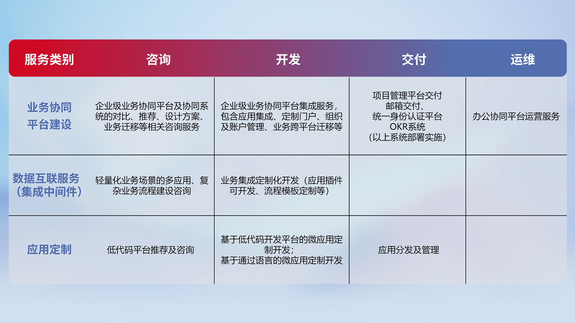针对钉钉、、、、企微、、、、IDaas等平台级产品提供产品的规划、、、、方案、、、、交付、、、、定制化开发等服务,,实现如统一协同办公、、、、智能客户服务、、、、混合会议管理、、、、智能数据查询、、等业务场景,,,,实现数字化转型。。。。